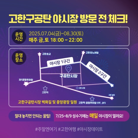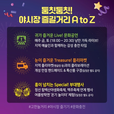 - 취지: 한때 석탄산업의 중심지였던 정선 고한 구공탄시장이 1967년 개설 이후 쌓인 추억과 이야기를 간직한 채, ‘달빛 아래 즐기는 고한의 밤’이라는 콘셉트로 재탄생한 전통시장형 야시장입니다