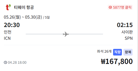 - 노선: 인천 ICN ↔ 사이판 SPN