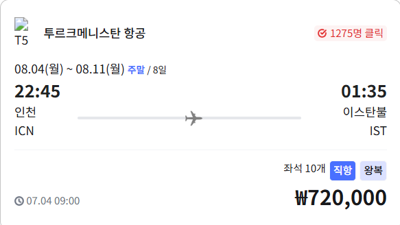 투르르크메니스탄항공 직항 항공권(인천→이스탄불, 왕복·8일 일정)이 ₩720,000에 출시되었습니다.