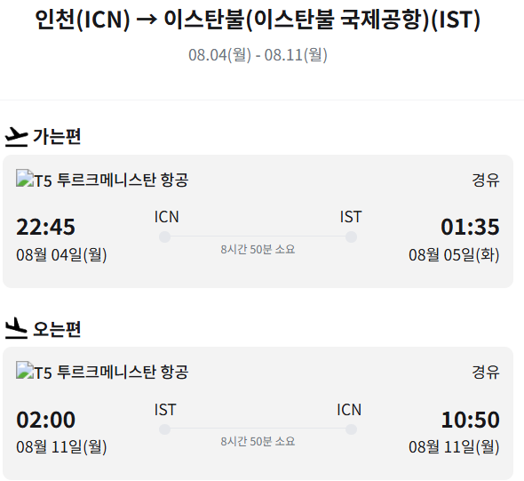 - 일정: 2025.08.04(월) 22:45 인천(ICN) 출발 ➡️ 08.11(월) 01:35 이스탄불(IST) 도착 (7박 8일)