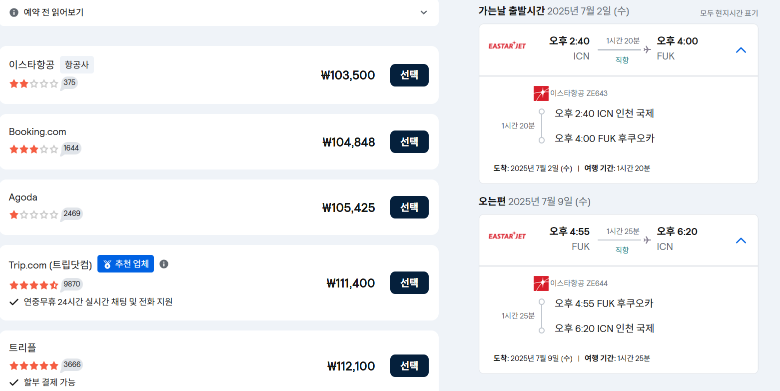 - 출발: 2025년 7월 2일(수) 14:40 ICN → 16:00 FUK (비행 1h 20m)