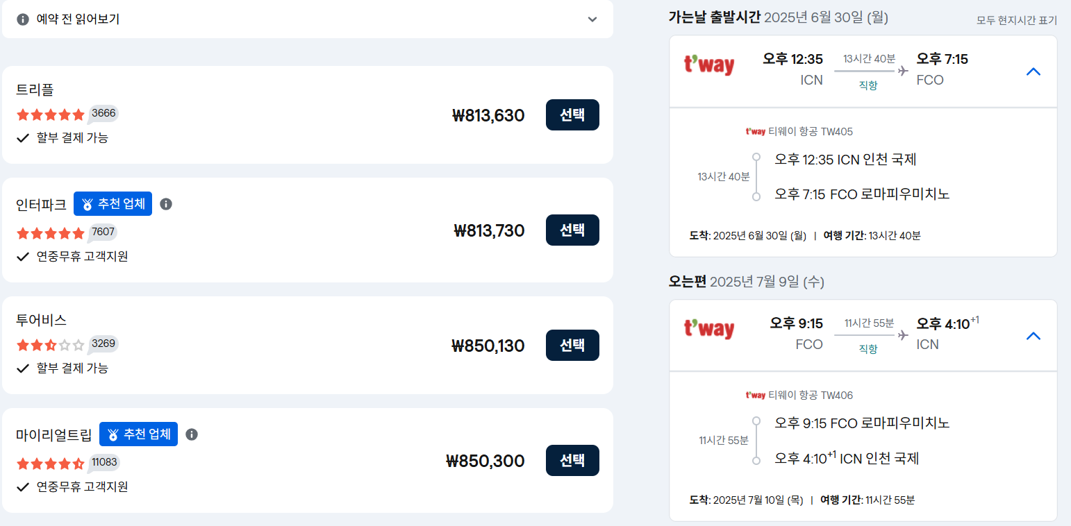 - 출발: 2025년 6월 30일(월) 12:35 ICN → 19:15 FCO (비행 13h 40m)