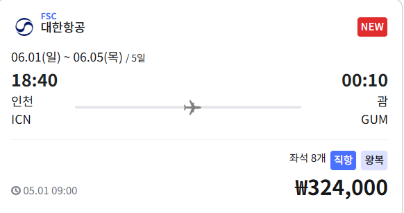 - 출발/도착 시간: 18:40 인천 출발 → 00:10 괌 도착