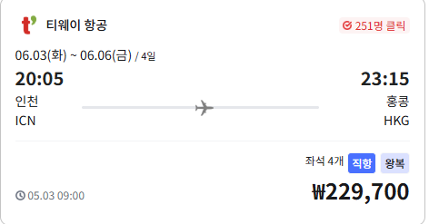 출국: 06월 03일(화) 20:05 인천 → 23:15 홍콩