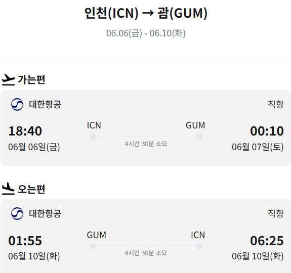 - 노선: 인천(ICN) → 괌(GUM)