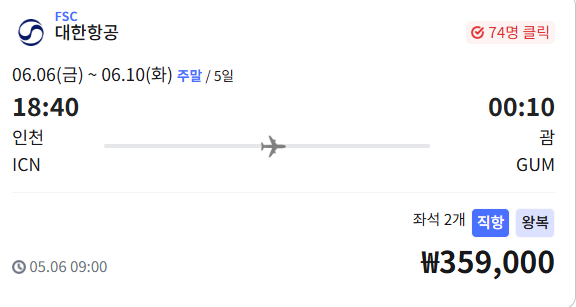 | ✈️✈️✈️"대한항공 괌 왕복 32만원대! 6월 주말 포함 특가 항공권 정보" (0) | 2025.05.08 |