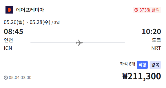 - 출발 시각: 08:45 인천 출발 → 10:20 도쿄 도착