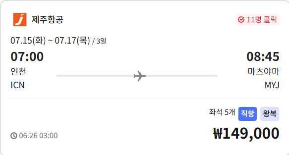 - 출발: 07.15(화) 07:00 인천(ICN) → 08:45 마츠야마(MYJ)