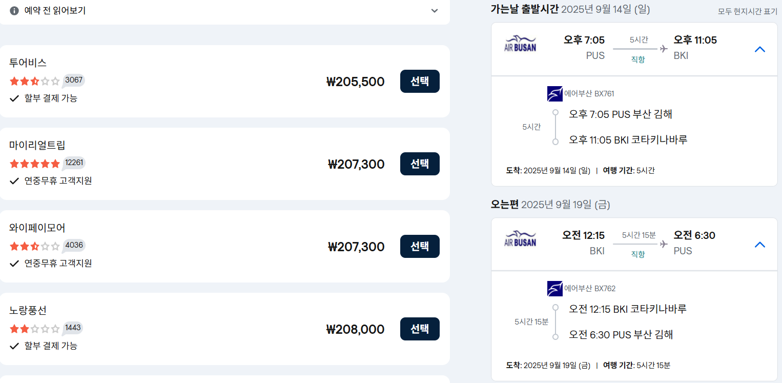 - 가는 날: 2025.09.14(일) 19:05 PUS(부산 김해) → 23:05 BKI(코타키나발루) (직항, 5시간)