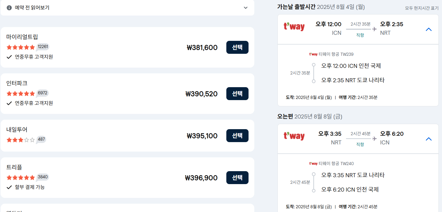 - 출발: 2025.08.04(월) 12:00 인천(ICN) → 14:35 도쿄 나리타(NRT) (직항, 2시간 35분)