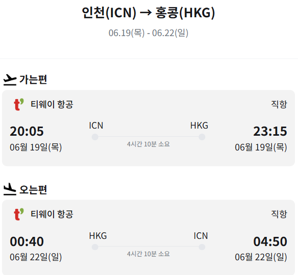 - 여정: 06.19(목) 20:05 인천(ICN) → 홍콩(HKG) ▶ 06.22(일) 23:15 홍콩(HKG) → 인천(ICN)