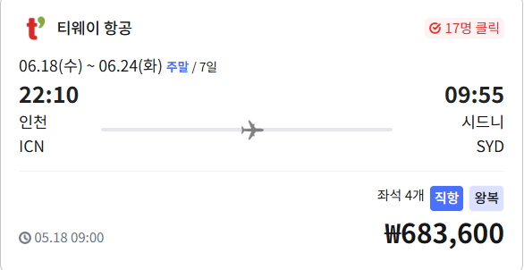 | ✈️티웨이항공 시드니 직항 특가! 6월 11일 출발 왕복 ₩683,600부터🔥 (0) | 2025.05.23 |