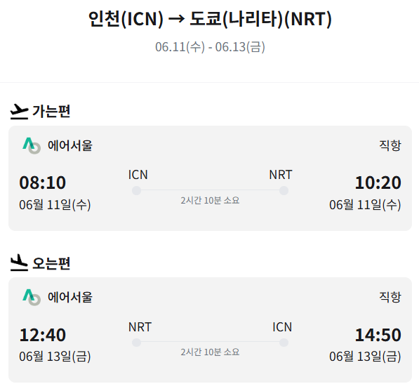 - 도착 시간: 6월 11일 10:20 도쿄 나리타(NRT) 도착