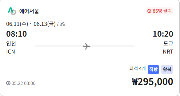 - 운임: 왕복 ₩295,000 (세금 포함)