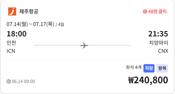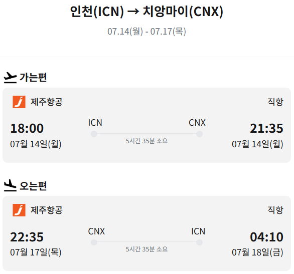 | 여정 | 07.14(월) 18:00 ICN → CNX 21:35 07.17(목) CNX → ICN (시간 별도 확인) |