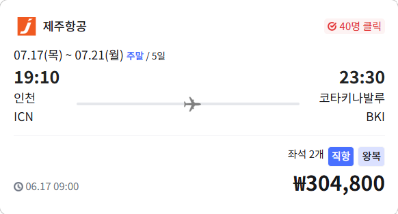 | 여정 | 07.17(목) 19:10 ICN → BKI 07.21(월) BKI → ICN (시간 별도 확인) |