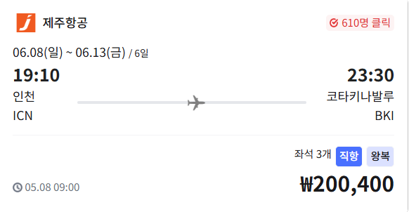 제주항공 직항으로 말레이시아 코타키나발루 왕복이 단 ₩200,400대부터 가능합니다!