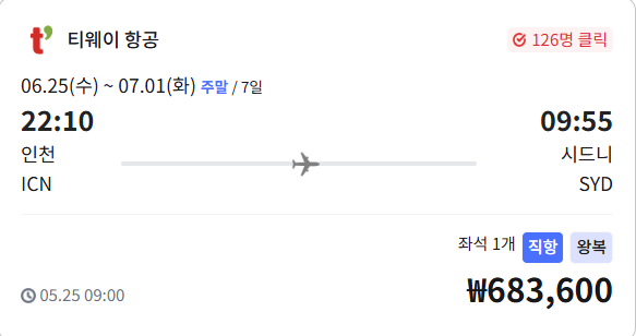 | ✈️77만원대 시드니 직항!2025년 6월 티웨이항공 인천-시드니 왕복 특가 항공권 정보💸 (0) | 2025.05.26 |