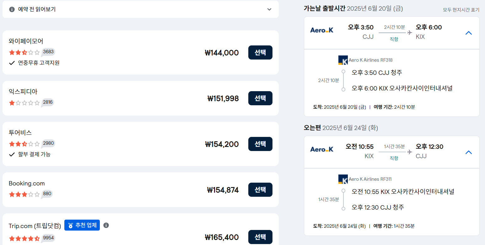 2025년 6월 20일(금) 청주(CJJ)→오사카 간사이(KIX) 왕복 직항