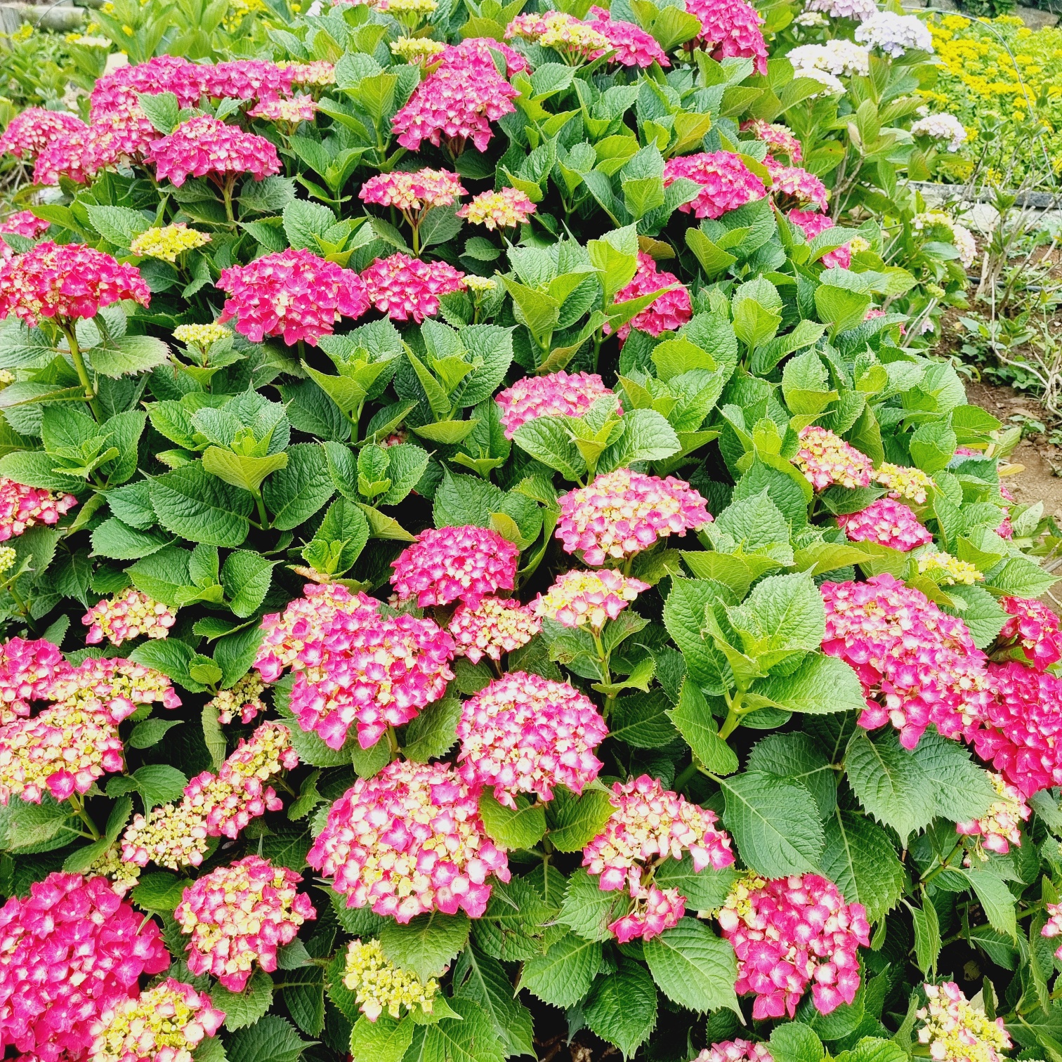 은은한 연두색과 짙은 초록 잎사귀 사이로 화려한 수국꽃이 싱싱하게 빛나긴 했지만