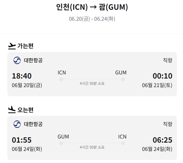 - 노선: 인천(ICN) → 괌(GUM)