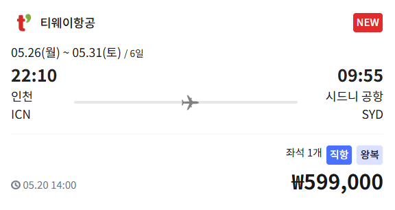 호주 시드니 직항 특가! 티웨이항공 왕복 59만 9천원 ✈️