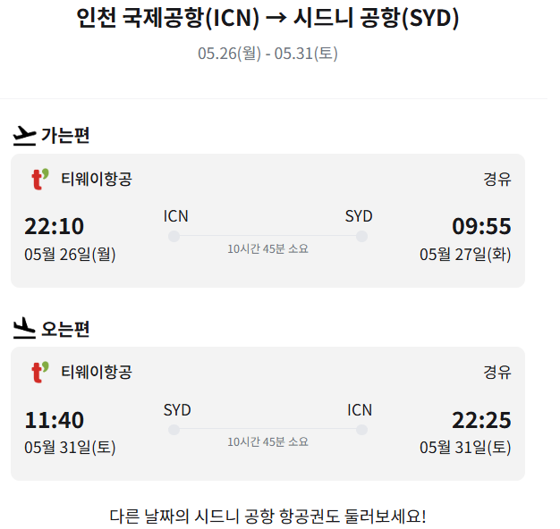 - 도착 시각: 5월 27일(화) 09:55 시드니 도착
