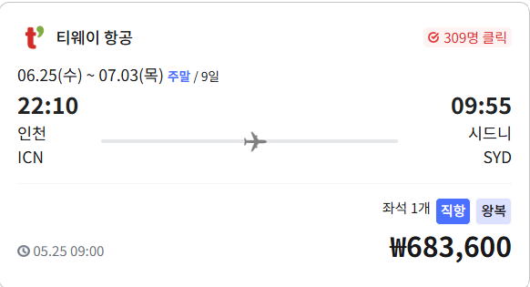 🛫 9일 일정에 이 가격이라면 시드니 항공권 중에서는 꽤 괜찮은 편이에요!