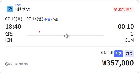 | ✈️✈️인천→괌 왕복항공권 35만7천원 특가! 7월 주말 5일 여행 (0) | 2025.06.18 |