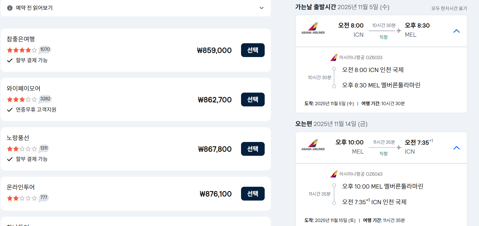 - 귀국: 멜버른(MEL) 11/14 22:00 → 인천(ICN) 11/15 07:35 (직항, 11시간 35분)