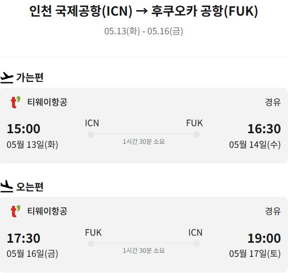- 귀국: 5월 16일(금) 16:30 후쿠오카 출발