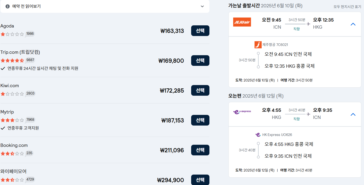 출국: 6월 10일(화) 오전 9:45 인천(ICN) ✈ 오후 12:35 홍콩(HKG)