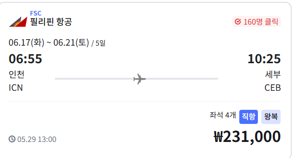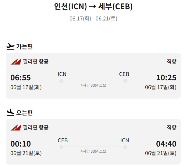 - 📆 여정: 2025.06.17(화) 06:55 ICN → CEB → 06.21(토) 10:25