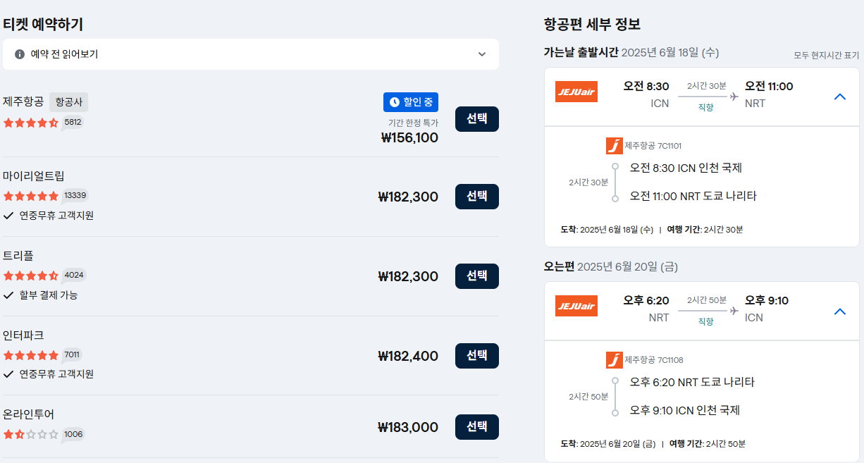 오는 편: 오후 6:20 나리타 출발