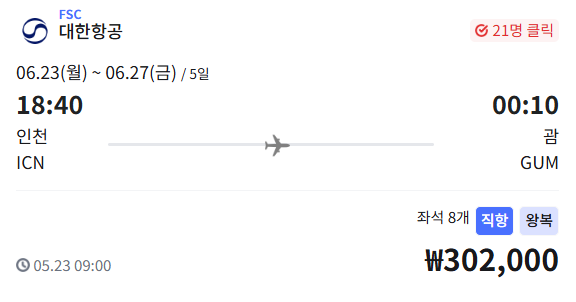 대한항공 직항으로 인천↔괌 노선 왕복이 단 ₩302,000!