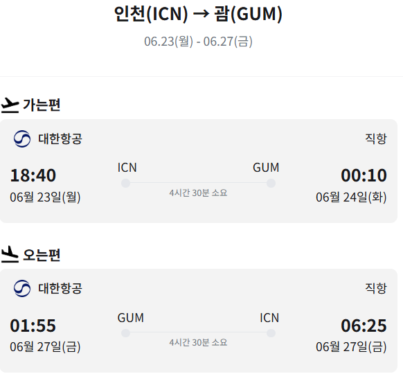 - 노선: 인천(ICN) ↔ 괌(GUM)