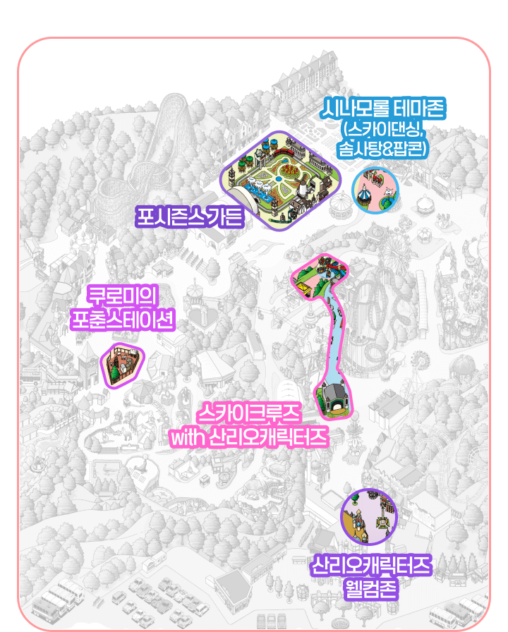 포시즌스가든에는 산리오 캐릭터별 스토리를 담은 11개의 테마존이 마련되어 있으며, 곳곳에 포토존이 있어 인생샷을 남기기에 제격입니다. 또한, 글로벌페어와 매직랜드 등 에버랜드 전역에서 캐릭터들을 찾아보는 재미도 놓치지 마세요!