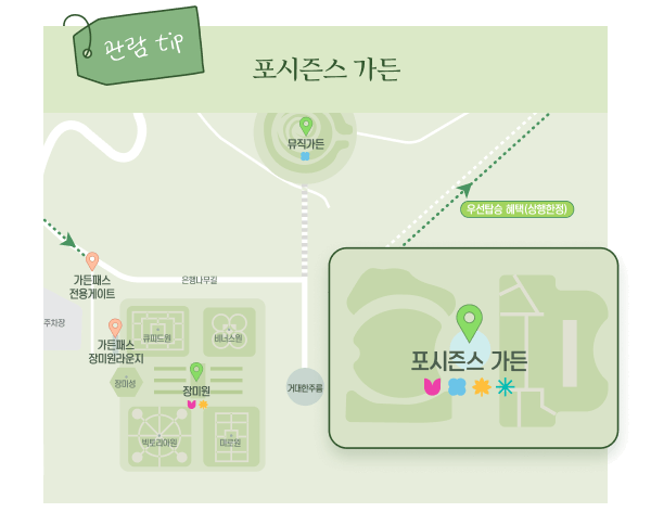 - 특징: 약 120만 송이의 튤립과 수선화, 무스카리 등 100여 종의 봄꽃이 만개한 포시즌스가든에서 산리오 캐릭터들과 함께하는 특별한 경험