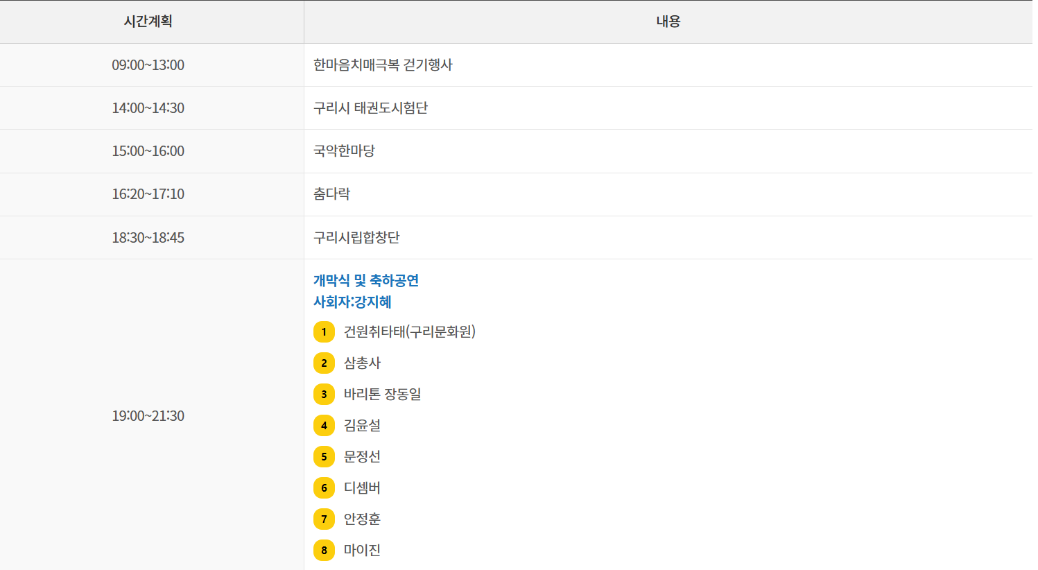 축제 기간 중에는 임시 주차장과 셔틀버스가 운영될 수 있으므로, 구리시청 홈페이지에서 교통 안내를 꼭 확인해 주세요.