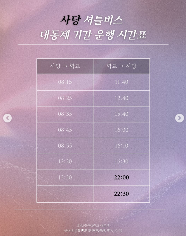 대동제를 맞이해 5월 21일~22일, 셔틀버스 운행 시간이 조정됩니다.