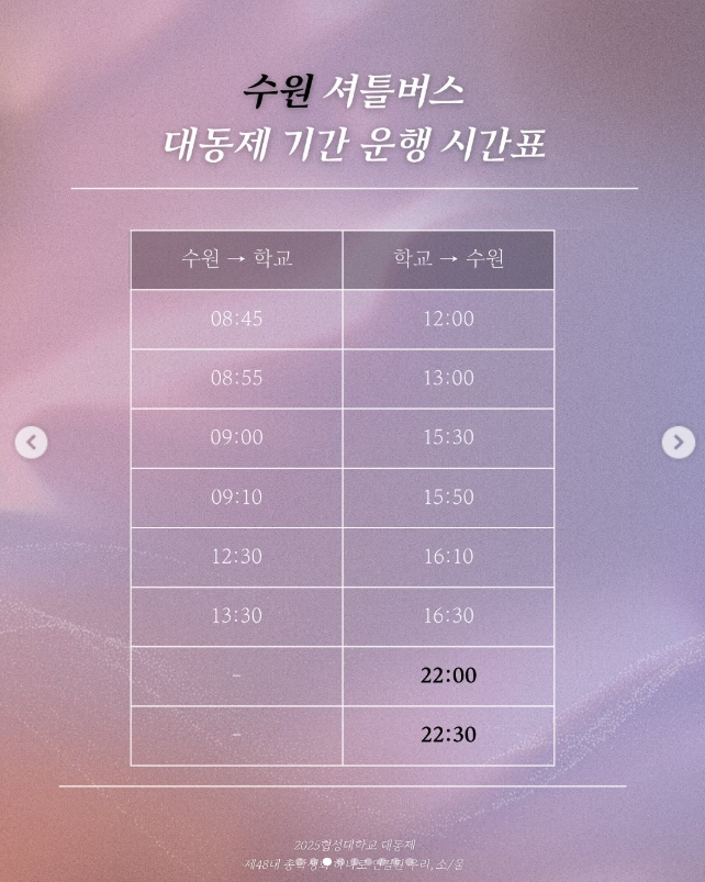 정확한 시간표는 교내 공지 또는 총학생회 SNS를 통해 확인해 주세요! 🎫