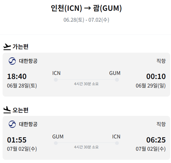 - 📆 여정: 2025.06.28(토) 18:40 ICN → GUM → 07.02(수) 00:10