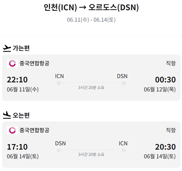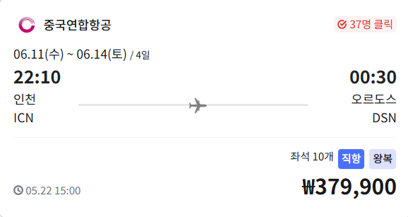 중국연합항공 직항편으로 오르도스 왕복이 37만 원대에 가능합니다!