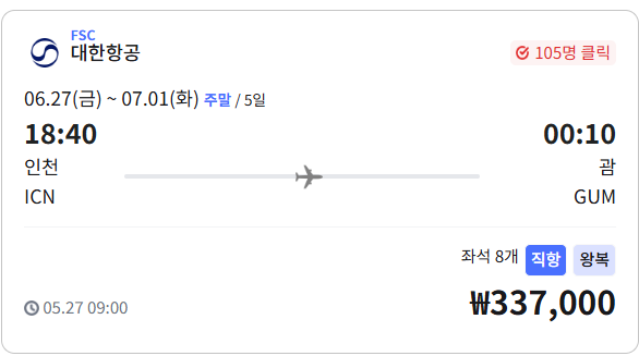 | 🏖️ 인천→괌 직항 왕복 ₩302,000! 6/28~7/2 5일 주말 휴양 스페셜 ✈️🌞 (1) | 2025.05.29 |