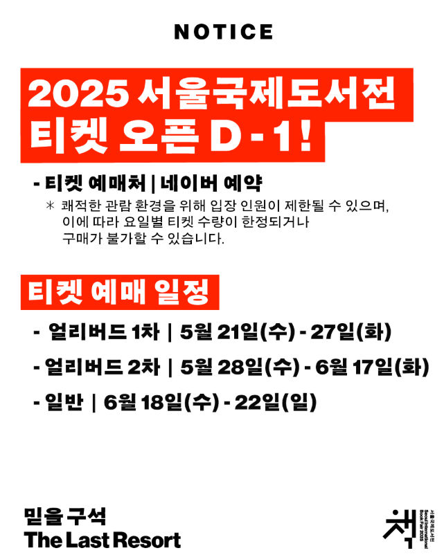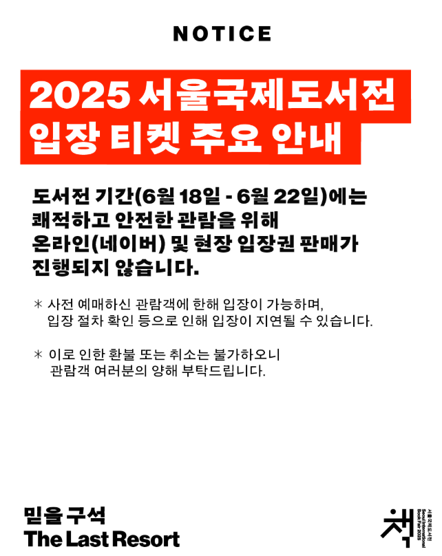 2025 서울국제도서전은 ‘믿을 구석(The Last Resort)’이라는 주제로, 삶 속 고난과 혼돈을 함께 견뎌주는 존재들을 다시 돌아보는 시간을 마련합니다.