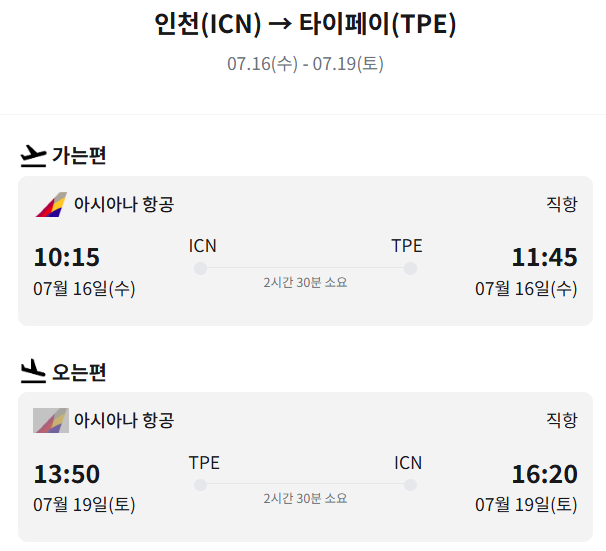 - 노선: 인천(ICN) ↔ 타이베이(TPE)