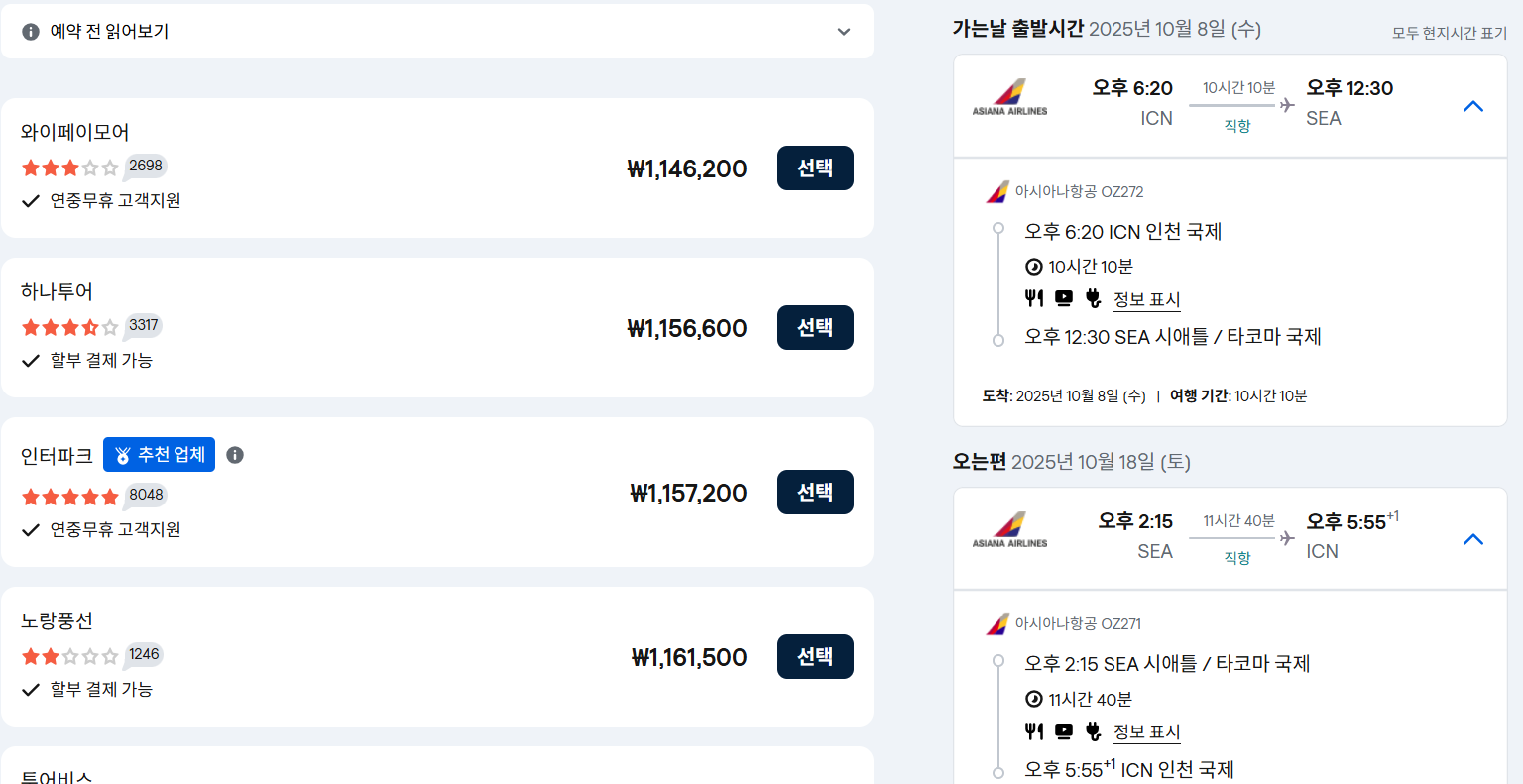 🔹 출국: 2025년 10월 8일 (수) 오후 6:20 ICN → 오후 12:30 SEA (소요시간: 10시간 10분)