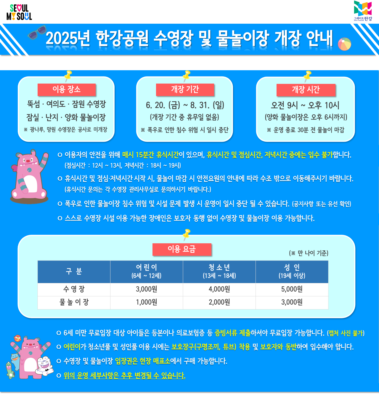 - 안전수칙: 구명조끼·안전요원 배치, 어린이 보호자는 반드시 동반 입장