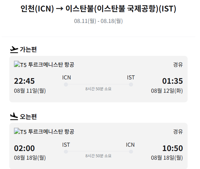 - 출국: 8/11(월) 22:45 ICN → IST 01:35(+1일)