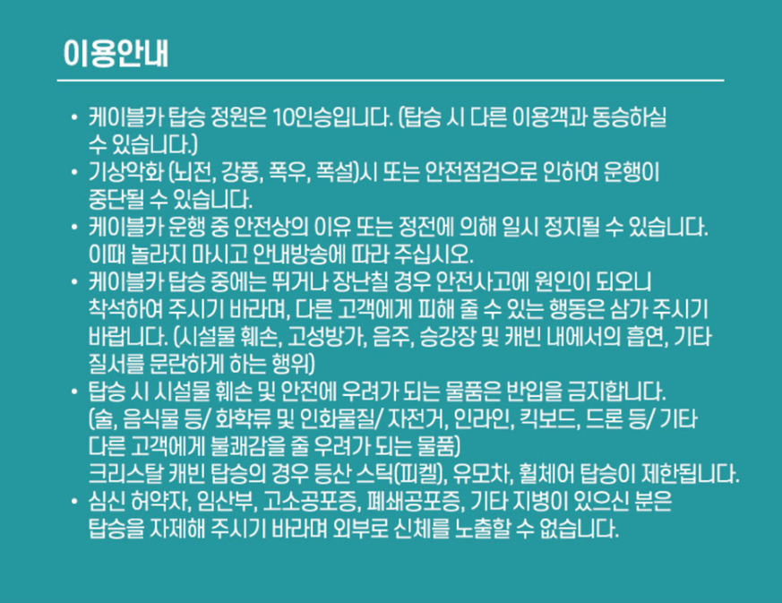 - 탑승 절차: 매표소·키오스크에서 QR코드 제시 ▶ 탑승권 수령 ▶ 캐빈 탑승